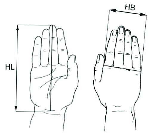 | Størrelse | Håndflate bredde (HB) | Lengde (HL) |