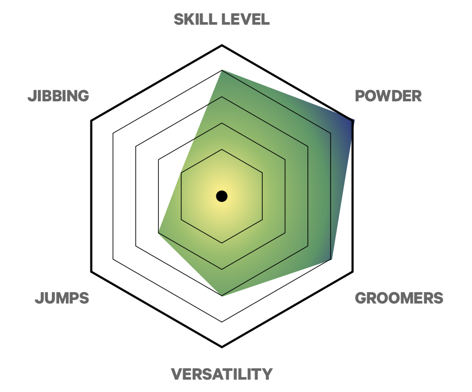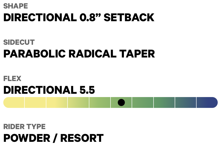 "Dette brettet passer 90% av våre kunder. Liker du å kjøre rundt i hele anlegget uten å riskere liv og lemmer hver tur? Da er dette brettet et helt korrekt valg. Det er veldig lettkjørt, flyter overlegent i løssnøen, cruiser fine svinger i anlegget og ser ut som en million. Det kan fint hoppes med, men er ikke for den rotasjonivrige park-rotta. Du må ikke ha veldig stor fart før det begynner å oppføre seg perfekt. Det har en medium+ stiv fleks og tåler også at du slipper opp i brattere nedfarter. Jeg veier 80kg og testet den i 158cm. Jeg ville nok hatt dette brettet i 161cm eller 164cm om jeg skulle kjørt det i større anlegg. Da hadde jeg fått ekstra superflyt i løssnøen og svingene på helkant hadde sittet enda bedre. Er du ikke den som må innom parken hele tide er jeg sikker på at dette brettet blir din beste venn" SIMEN STRANDÅS