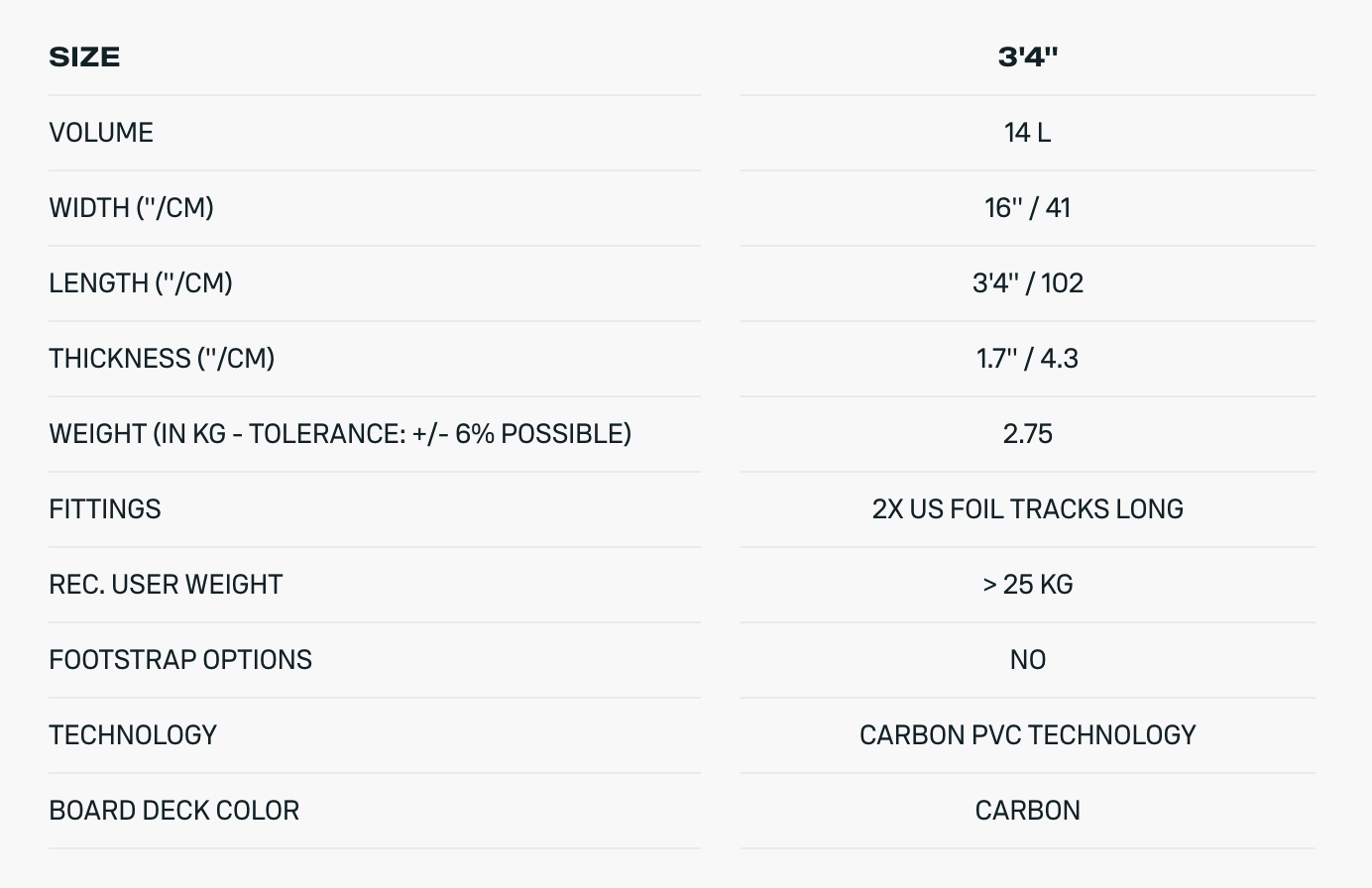Kompakt: Kompakte dimensjoner gir minimal svingvekt. Perfekt grep for lett bryggestart: Tynne rails som er lette å holde i ved start fra brygge. Lett padling med brett: Tilstrekkelig volum for å løfte brettet ved padling. Effektiv pumping: Flat rocker for maksimal pumpeeffektivitet. Minimal motstand ved touchdowns: Enkel konveks til flat bunn gir lav motstand ved kontakt med vannet. Direkte kraftoverføring: Sterk konstruksjon i karbon/PVC for direkte kraftoverføring til foilen.