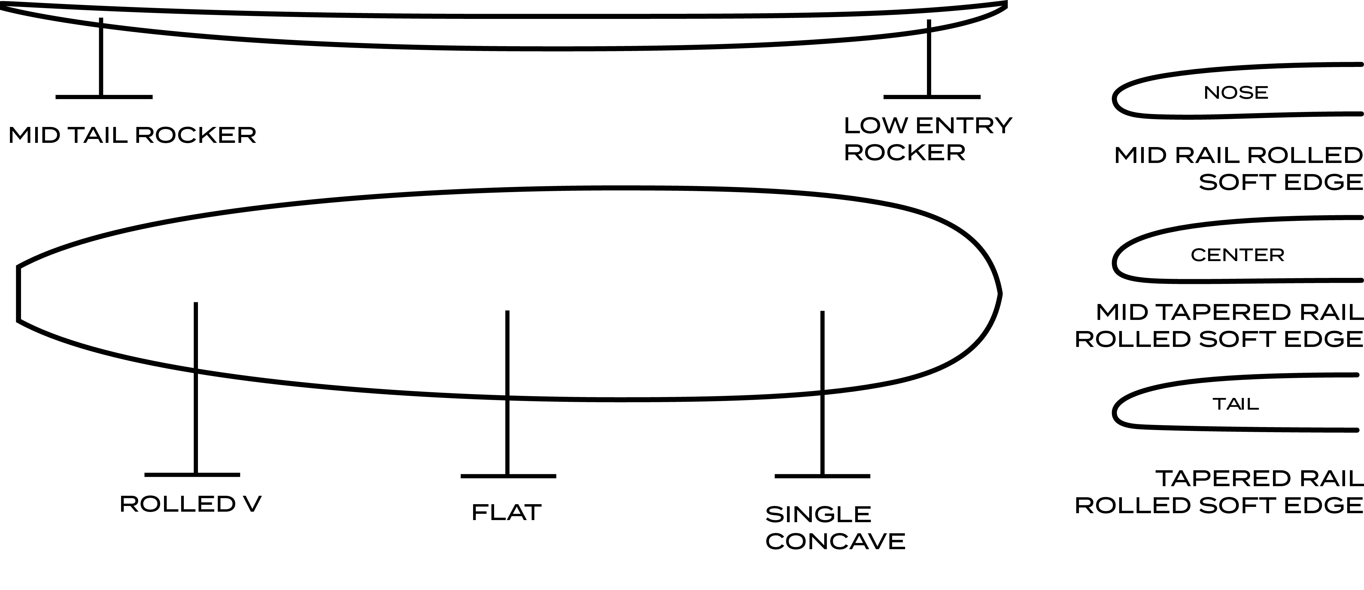 • 8'0" x 22" x 2.3" - 57.3L • 9'0" x 23.3" x 3" - 74.8L • 9'4" x 23.5" x 3.25" - 84.8L |