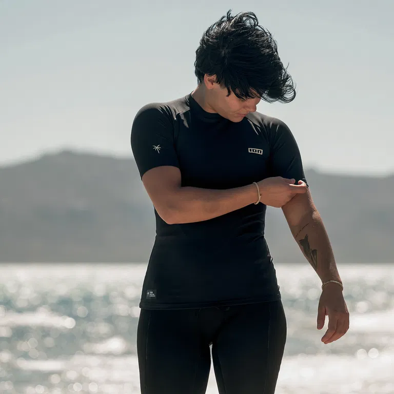 The Rashguard Short Sleeve women provides lightweight UV protection with a snug and flexible fit. This classic is made from recycled materials and comes with a stylish back print. With the raglan style sleeves, we minimized seams in the shoulder area, enhancing wearing comfort. Ride with ease thanks to the slip_loop, which lets you connect the top to boardshorts. 84% Polyester (recycled) 16% Elastan